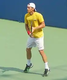 Thomas Mario Haas (German pronunciation: [ˈtɔmi ˈhaːs]; born 3 April 1978) is a German former professional tennis player. He competed on the ATP Tour from 1996 to 2017. After breaking into the world top 100 in 1997, and reaching a career-high singles ranking of world No. 2 in May 2002, his career was interrupted by injuries: Haas twice dropped out of the world rankings due to being unable to play for twelve months.[1] His first period of injury saw him miss the whole of the 2003 season, and he did not return to the world's top 10 until 2007. He also missed over a year's tennis between February 2010 and June 2011, but afterwards returned to play on the tour. He returned to world No. 11 in 2013, after reaching the quarterfinals at the French Open for the first time in his career. Haas reached the semifinals of the Australian Open three times, and in Wimbledon once. He reached the quarterfinal stage of each of the Grand Slam events. He won 15 career titles in singles, including one Masters tournament (Stuttgart) in 2001, and has a silver medal from the 2000 Summer Olympics.