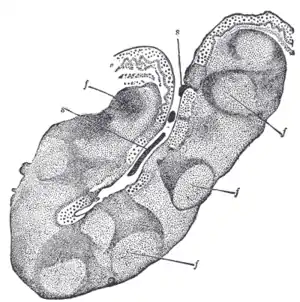 ![]() Low-power microscope magnification of a cross-section through one of the tonsillar crypts (running diagonally) as it opens onto the surface of the throat (at the top). Stratified epithelium (e) covers the throat's surface and continues as a lining of the crypt. Beneath the surface are numerous nodules (f) of lymphoid tissue. Many lymph cells (dark-colored region) pass from the nodules toward the surface and will eventually mix with the saliva as salivary corpuscles (s). | |