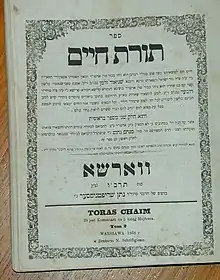 Toras Chaim (Hebrew: תורת חיים, "Torah of Life") is a two-volume work of Hasidic discourses on the books of Genesis and Exodus by the second Chabad Rebbe, Rabbi Dovber Schneuri.[1][3] The work is arranged in a similar fashion as Likutei Torah/Torah Or, a fundamental work on Chabad philosophy authored by Rabbi Dovber's father, Rabbi Shneur Zalman of Liadi, the founder of the Chabad movement. Both works are arranged according to the weekly Torah portion.