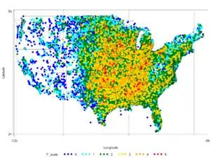All tornadoes in the Contiguous United States, 1950–2013, plotted by midpoint, highest F-scale on top, Alaska and Hawaii negligible, source NOAA Storm Prediction Center.