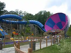 The Tornado is a water slide manufactured by ProSlide Technology. It requires riders to sit in a 2-6 seater round tube. Riders drop from inside a tunnel out into the ride's main element shaped like a funnel on its side. Riders oscillate from one side to the other until they exit through the back of the funnel and into a splash pool. Many of the slides feature a conveyor belt to bring the rafts to the top. On April 13, 2012 it was announced the first six-person Tornado would be built using Hydromagnetic technology.[1]