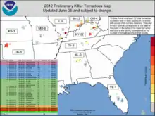 ![]() Approximate touchdown location of killer tornadoes in 2012 Summary of tornadoes[4]