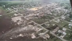 A moderate outbreak of 44 tornadoes impacted the central United States in early May 2014. On May 10, numerous supercell thunderstorms developed across Missouri in advance of an intensifying upper-level low over the Great Basin. One supercell spawned a damaging EF2 tornado that moved through downtown Orrick, Missouri, causing significant damage but no fatalities. 80% of the structures in Orrick were damaged, and the school sustained major damage and lost much of its roof.[32] On May 11, the upper-level low continued eastward into the Plains, providing ample wind shear for tornadoes; in preparation for the event, the Storm Prediction Center issued a Moderate risk for severe weather. Numerous thunderstorms developed across the Midwest – particularly Kansas, Nebraska, and Iowa – spawning many tornadoes. A large multiple-vortex EF3 tornado passed near the town of Sutton, Nebraska, causing considerable damage to farm properties and flattening an unanchored farmhouse. Powerful rear flank downdraft winds spawned by the parent supercell severely damaged downtown Sutton.[33] Another very large rain-wrapped EF3 wedge tornado passed near the town of Cordova, Nebraska, destroying multiple homes nearby, spawning multiple satellite tornadoes, and growing to well over a mile wide at times. The Cordova tornado eventually struck the town of Beaver Crossing before dissipating, damaging virtually every structure in town, with a few destroyed. Two separate tornadoes; rated EF2 and EF1, also caused severe damage near the town of Raymond. Numerous other less significant tornadoes touched down in Nebraska and other states that evening as well.[34] Later that night, an EF2 tornado largely destroyed a lakeside condominium building near Yale, Iowa.[35] Two weak EF0 tornadoes touched down in northern Ohio on May 12 before the outbreak came to an end.[36]