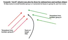 In the 1930s, the Imperial Japanese Navy developed the best way for torpedo bombers to achieve a hit. They used an "anvil attack", in which two groups of torpedo planes approached the target ship's bow from behind at an angle of about 45 degrees, one on each side of the ship. The torpedoes were to be launched at the same distance from the ship; this would have ensured a hit no matter where the ship tried to maneuver. In practice, this kind of attack was difficult to coordinate and therefore extremely rare. Usually, combat air patrols and anti-aircraft fire quickly broke up approaching plane formations, forcing each aircraft to attack on its own. At Pearl Harbor, the ships were lined up and basically stationary, so the first attack wave of 40 torpedo bombers armed with Type 91 torpedoes, out of 183 planes, were able to hit the ships broadside, as the defenders were caught by surprise.