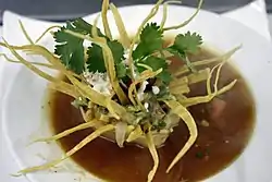 Tortilla soup (Spanish: sopa de tortilla) is a traditional Mexican soup made of fried corn tortilla pieces,[1] submerged into a broth of tomato, garlic, onion, and chile de árbol and epazote. It is served with pieces of pasilla chiles, chicharrón, avocado, fresh cheese cubes and sour cream. Although the exact origin of tortilla soup is unknown, it is known that it comes from the Mexico City area in Mexico. Traditional tortilla soup is made with chicken broth combined with roasted tomatoes, onion, garlic, chiles and tortillas, cut into strips and fried. There are some variations, for example the broth being made with a thickened tomato base and ground tortillas or a bean soup enriched with crunchy strips of fried tortillas. [2][3]