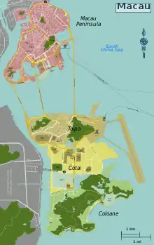 Due to land reclamation in Macau, the islands of Taipa, Cotai and Coloane are "more like one big island these days".[1] Evident from its name, Cotai is located between Taipa and Coloane, created by infilling marsh in-between the two islands. Taipa is a popular destination, where tourists may choose to head to the narrow streets of old Taipa Village for dinner and shopping. Notable places to visit in Taipa are the Taipa Houses–Museum and the Museum of Taipa and Coloane History.[1]