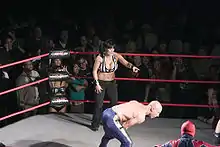 During an interview with Goldy Locks, Brooks and Veronica announced that TNA officials would no longer allow women to compete against men; however, they would continue to work together as a stable named Bitchslap.[8] The duo then issued an open challenge to any women in attendance. TNA cage dancers April Pennington and Lollipop (who was attacked by Brooks several weeks earlier[9]) accepted the challenge. They tried attacking Brooks and Veronica but were stopped by TNA security guards.[10] The following week, Lollipop challenged Bitchslap to a match. Veronica (without Brooks present) accepted, but was attacked by both Lollipop and Pennington until TNA security again stopped the catfight.[11] Veronica then replaced Brooks with a new partner, Cheerleader Valentina (who had earlier competed as JV Love on TNA Xplosion in a match against Brooks[12][13]). The reason for the replacement is because Brooks was unable to travel from Canada to the TNA taping. The storyline with Bitchslap was eventually dropped because TNA didn't have enough female wrestlers to compete against the group,[14] and Veronica turned down a two-year contract with TNA, instead attempting to sign with either WWE or a company in Japan.[15] Brooks was removed from television for repackaging, Trinity was placed into other storylines, and TNA stopped booking Valentina.