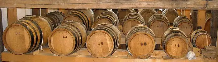 TBV is produced in two different geographical areas of the Emilia Romagna Region so that two different designations were granted by the European Council, i.e. Traditional Balsamic Vinegar of Modena (TBVM) and Traditional Balsamic Vinegar of Reggio Emilia (TBVRE). The two special vinegars are very similar products as the overall making procedure is the same; but, from a legal point of view, they are obtained according to specific and official production regulations[9][10] defining (1) the basis of the vineyards ampelographic; (2) geographical area of production; (3) characteristics of starting materials; (4) making procedure; (5) the chemical, physical and sensorial requirements for sale; (6) bottling, labelling and presentation. The sensory profile of TBV is evaluated by hedonic judgment expressed through a numeric score. The sensory score achieved is used to rank TBV in different commercial classes. The specific regulations allow adding "Extra Vecchio" to the official designation when the product is aged for 25 years at least. However, under existing regulations, neither the definition of "aging" nor the methods for its objective evaluation are specified; it is evaluated only through panel-tasting tests, whose effectiveness for this purpose is clearly inadequate.[11] TBV results as a blend of vinegars of different composition and age due to the traditional making procedure. Actually, an easy-to-use mathematical method for evaluating the actual residence time of TBV within each cask of the barrel set has been recently published.[12] This method is an adequate tool helping aging certification. An easy-to-use spreadsheet of the theoretical model is available for download.[13] At present, however, independent agencies that officially state TBV authenticity of both the TBVM and TBVRE haven't adopted it or any analogous procedure as an evaluation system.