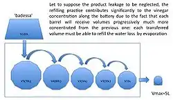The making procedure of TBV is a semicontinuous process requiring the annual refilling activity, consisting of withdrawing only a part of the vinegar from the smallest cask and topping it with the vinegar coming from the next cask along with the barrel set, and so on. The biggest cask receives new cooked and acetified must. This refilling procedure resembles the Solera method used for making sherry wine. The purpose of refilling in the TBV making is to keep the vinegar volume constant inside every cask in the barrel set, and compensate for the volume drop caused by these three factors: TBV withdrawn for bottling, water evaporation, and possible vinegar leakages from the staves. Refilling involves the product flux-splitting from the biggest to the smallest cask, leading to the solute dislocation along the barrel set.