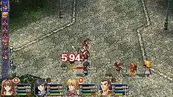 The combat of Trails is turn-based with tactical elements. Unlike most other turn-based games, the series lacks random encounters as most enemies are visible on the overworld.[7][12] Combat takes place on a large grid, with characters only able to move across a set number of squares or perform a single ability each turn.[9] Turns are listed on a timeline on the screen, which can be manipulated with certain abilities.[12] In addition to basic attacks and item usage, every character has abilities known as Crafts and Arts.[9] Crafts are unique to each character and are usually unlocked or strengthened by leveling up.[9] S-Crafts are a character's ultimate ability fueled by a meter that builds as they deal and take damage. When full, players can use it at any time to bypass the turn order to perform skills such as dealing large amounts of damage or supporting their party with healing and buffs.