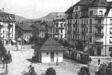On 1 July 1901, services commenced on line III. This led from Breitenrain to Burgernziel via the Zytglogge.[1] For four and a half months, Bern had three types of tram traction at the same time. The opening of the Gürbetalbahn enabled the replacement of the city's horse bus services. On the other hand, plans for the extension of line II were abandoned. The last day of operation of the pneumatic trams was 15 November 1901. None of the pneumatically powered vehicles have been preserved, but the old Depot and a bus shelter at the Bärengraben continue to remind Bernese residents today of the Lufttram era. The Bärengraben depot was abandoned and sold three years later.