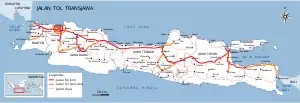 The Trans-Java Toll Road is a tolled expressway network that runs from Port of Merak in Cilegon, the main link between the island of Sumatra and Java, to Banyuwangi, the eastern end of the island in Indonesia and the main link between the island of Java and Bali. It mainly runs through the northern coast of the island, except for the section between Semarang and Surabaya, where it runs through the centre and south of the island. It runs through five of the six provinces on the island of Java (DI Yogyakarta being the sole exception), connecting the major cities of Jakarta, Cirebon, Semarang, Solo, and Surabaya. The toll road is the land transportation backbone of the island and is the most important toll road network of the country. The toll road has a total length of 1,167 kilometres (725 mi).[1]