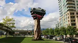 Trans Am Totem was a public art installation in Vancouver, British Columbia, Canada, created by sculptor Marcus Bowcott. Part of the Vancouver Biennale, the piece was unveiled in April 2015. Located at the intersection of Quebec Street and Milross Avenue, near False Creek, east of Vancouver's Downtown area, the sculpture incorporated stacked cars on top of a base made from a tree trunk.[1] It stood 10 metres (33 ft) high and weighed 11,340 kilograms (25,000 lb).[2] It was dismantled on August 15, 2021, to be restored and reinstalled in a new location by the summer of 2022. [3]