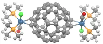 Vaska's complex forms a 1:1 adduct, and the analogous IrCl(CO)(PEt3)2 binds 200x more strongly.[2] Complexes with more than one fullerene ligand are illustrated by Ir4(CO)3(μ4-CH)(PMe3)2(μ-PMe)2(CNCH2Ph)(μ-η2:η2C60)(μ4-η1:η1:η2:η2C60). In this Ir4 cluster two fullerene ligands with multiple types of mixed binding. Platinum, palladium, and nickel form complexes of the type C60ML2 where L is a monodentate or bidentate phosphorus ligand.[5] They are prepared by displacement of weakly coordinating ligands such as ethylene:[6]