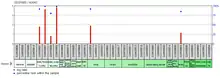 The secondary structure of the protein is predicted to consist of approximately alpha helices and beta sheets (the exact location and number of which depend on the program which is used for the prediction) but no coiled coils.[8][9][10] Diagrams of the predicted tertiary structure and transmembrane domains[11] are to the right.