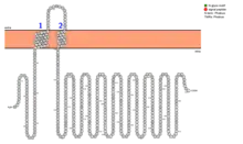The protein has a length of 566 amino acids and contains two transmembrane domains.[6] According to Compute pI/Mw, molecular weight of approximately 61 kDa, which matches the weight listed on NCBI, and a theoretical isoelectric point of 6.72.[11][6] The human TMEM151B protein composition is poor in lysine and arginine, lysine comprising 1.4% of the amino acids and arginine making up 0.8% of the total protein. The mouse ortholog is also arginine poor.[12]