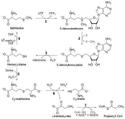 An example of transmethylation is the recovery of methionine from homocysteine. In order to sustain sufficient reaction rates during metabolic stress, this reaction requires adequate levels of vitamin B12 and folate. Methyl tetrahydrofolate delivers methyl groups to form the active methyl form of vitamin B12 that is required for methylation of homocysteine. Deficiencies of vitamin B12 or folate cause increased levels of circulating homocysteine. Elevated homocysteine is a risk factor for cardiovascular disease and is linked to the metabolic syndrome (insulin insensitivity).[1]