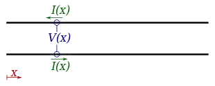 A transmission line is drawn as two black wires. At a distance x into the line, there is current I(x) travelling through each wire, and there is a voltage difference V(x) between the wires. If the current and voltage come from a single wave (with no reflection), then V(x) / I(x) = Z0, where Z0 is the characteristic impedance of the line.