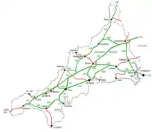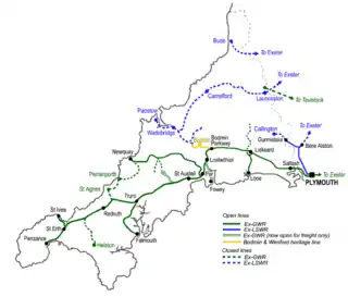The Cornish rail network suffered a substantial reduction during the 1960s due to the Beeching cuts. North Cornwall was hardest hit – the entire former North Cornwall Railway system which served Bude, Camelford, Wadebridge and Padstow was closed on 3 October 1966 (although the Wadebridge-Padstow section was retained for a further three months).[10]