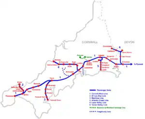 - Atlantic Coast Line (local passenger trains only) – Par to Newquay (20¾ miles)[17]