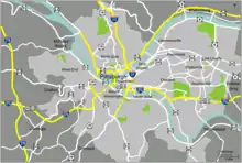 Unlike many other major U.S. cities, Pittsburgh lacks a dedicated contiguous beltway surrounding the city. I-76 (Pennsylvania Turnpike), I-79, and I-70 form a roughly triangular-shaped "beltway," but the distance of these roads from the city center and the need to exit and enter each leg in order to continue circling the city render them impractical as a beltway; commuters are forced to use secondary roads to go from suburb to suburb. The Allegheny County Belt System is an attempt at dealing with this without building additional infrastructure. The Pittsburgh Wayfinder System is a similar system that aims to guide travelers to popular destinations and services in the city proper.