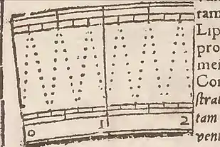 Tycho Brahe created a grid of transversal lines made with secants between two groups of arcs that form two graduated limbs. The secants are drawn by joining the division of a limb with the next division of the other limb, and so on (see figure with the magnification of 2 degrees of the Tycho Brahe's quadrant of 2m radius).[9]