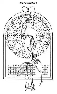 The traverse board is a wooden board with peg-holes and attached pegs. It is divided into two parts, upper and lower.