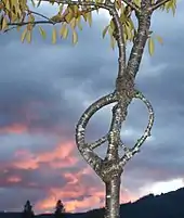 Dan Ladd is a Northampton, Massachusetts based American artist who works with trees and gourds. He began experimenting with glass, china, and metal inclusions in trees in 1977 in Vermont and started planting trees for Extreme Nature in 1978.[47] He became inspired by inosculation he noticed in nature and by the growth of tree trunks around man-made objects such as fences and idle farm equipment.[47] He shapes and grafts trees, including their fruits and their roots, into architectural and geometric forms.[47] Ladd calls human-initiated inosculation 'pleaching' and calls his own work 'tree sculpture'.[47] Ladd binds a variety of objects to trees, for live wood to grow around and be incorporated, including teacups, bicycle wheels, headstones, steel spheres, water piping, and electrical conduit.[47] He guides roots into shapes, such as stairs, using above-ground wooden and concrete forms and even shapes woody, hard-shelled Lagenaria gourds by allowing them to grow into detailed molds.[48] A current project at the DeCordova and Dana Museum and Sculpture Park in Lincoln, Massachusetts incorporates eleven American Liberty Elm trees grafted next to each other to form a long hillside stair banister. Another of his installations, Three Arches, consists of three pairs of 14-foot sycamore trees, which he grafted into arches to frame different city views, at Frank Curto Park in Pittsburgh.[38][49]