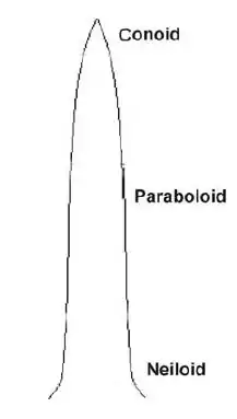 Tree trunks not only vary in shape from top to bottom, but also vary in shape over time. The overall shape of a tree trunk can be defined as a form factor: V = F · A · H, where A = area of the base at a designated height (such as 4.5 feet), H = full height of tree, and F = the form factor.[27] Examinations of white pines samples in Massachusetts found a sequence of progressive changes in shape over time. Young pines were found to have a form factor between 0.33 and 0.35, forest grown pines in the age class of 150 years or more had a form factor of between 0.36 and 0.44, and stocky old-growth outlier pines would on occasion achieve a form factor of between 0.45 and 0.47. The form factor concept is parallel to idea of percent cylinder occupation.[28][29] The volume of the trunk is expressed as a percentage of the volume of a cylinder that is equal in diameter to the trunk above basal flare and with a height equal to the height of the tree. A cylinder would have a percent cylinder occupation of 100%, a quadratic paraboloid would have 50%, a cone would have 33%, and a neiloid would have 25%. For example, the old growth hemlock trees (Tsuga canadiensis) measured as part of the Tsuga Search Project [30] were found to have occupation percentages from 34.8% to 52.3% for the intact, single trunked trees sampled. In general trees with a fat base or a trunk that quickly tapers scores low on the list, while trees that taper more slowly have higher values. Those trees with broken tops will have anomalously high values. If the base diameter is taken within the area of basal flare the overall volume will be anomalously low.