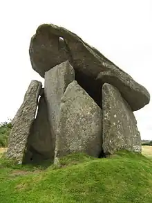 Trethevy Quoit is north of Liskeard in the hamlet of Tremar Coombe. Nearby Trethevy farmhouse is a Grade II* listed building.[3] Nearby are The Hurlers, three stone circles dating from the late Bronze Age. The site is owned and managed by the Cornwall Heritage Trust on behalf of English Heritage.[4]