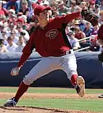 On June 27, 2012, the Diamondbacks called Bauer up from Reno in order to replace an injured Joe Saunders. He was scheduled to start the next day, becoming the first member of the 2011 draft class to make his MLB debut.[25] Although the Diamondbacks defeated the Atlanta Braves 3–2, Bauer earned a no-decision in his major league debut, pitching four innings before suffering a groin strain that required him to leave the mound.[26] He picked up his first win on July 8, holding the Los Angeles Dodgers to six scoreless innings as the Diamondbacks ultimately won 7–1.[27] After four major league starts, during which Bauer went 1–2 with a 6.06 ERA, he was sent back down to Reno, where he was shut down for a period of two weeks in order to preserve his health during his first full season of professional baseball.[28] He finished the season there, helping the Aces to reach their first Pacific Coast League and Triple-A baseball championships. In the championship game against the Pawtucket Red Sox of the International League, Bauer took another no decision as he allowed two runs in 4+2⁄3 innings.[29] In 14 total starts for Reno, Bauer posted a 5–1 record and a 2.85 ERA, striking out 97 batters in 82 innings.[21]