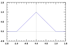 A triangular function (also known as a triangle function, hat function, or tent function) is a function whose graph takes the shape of a triangle. Often this is an isosceles triangle of height 1 and base 2 in which case it is referred to as the triangular function. Triangular functions are useful in signal processing and communication systems engineering as representations of idealized signals, and the triangular function specifically as an integral transform kernel function from which more realistic signals can be derived, for example in kernel density estimation. It also has applications in pulse-code modulation as a pulse shape for transmitting digital signals and as a matched filter for receiving the signals. It is also used to define the triangular window sometimes called the Bartlett window.