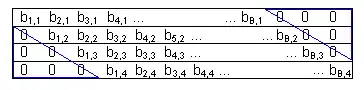 In TNC, coding is performed in two stages. First redundant "0" bits are selectively added at the head and tail of each packet such that all packets are of uniform bit length. Then the packets are XOR coded, bit-by-bit. The "0" bits are added in such a way that these redundant "0" bits added to each packet generate a triangular pattern.