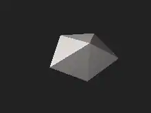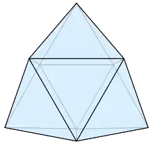 The triaugmented triangular prism can be constructed by attaching equilateral square pyramids to each of the three square faces of a triangular prism, a process called augmentation.[5] These pyramids cover each square, replacing it with four equilateral triangles, so that the resulting polyhedron has 14 equilateral triangles as its faces. A polyhedron with only equilateral triangles as faces is called a deltahedron. There are only eight different convex deltahedra, one of which is the triaugmented triangular prism.[6][7] More generally, the convex polyhedra in which all faces are regular polygons are called the Johnson solids, and every convex deltahedron is a Johnson solid. The triaugmented triangular prism is numbered among the Johnson solids as .[8]