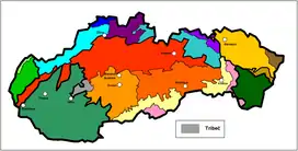 The Tribeč mountain range is 50 km (31 mi) in length and about 18 km (11 mi) in width, which places it as the 50th largest series of mountains in Slovakia. It is surrounded by Zlaté Moravce, Topoľčany, Partizánske and Nitra, giving it a rectangular shape.[1] Tribeč is also part of a larger belt of core mountains; The Fatra-Tatra Area. In the east, it connects to Pohronský Inovec and Vtáčnik, and descends into the Hornonitrian basin.