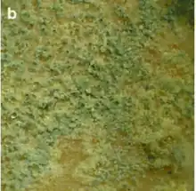 Images of T. atroviride growing on plates show green fruiting bodies and light-responsive conidiation. In these pictures they can also be seen growing in concentric circle zones on the face of the agar (see species box image).[6][4] Trichoderma species are ubiquitously described as having long filamentous hyphae and the ability to germinate on many different substrates. When the fungus grows it starts off as white, but then becomes various shades of green. Conidiophores are generally irregular in shape and number of conidia release and are also photosensitive and release when exposed to light.[7] Finally, Trichoderma are known for their fast growth rates, and ability to colonize most substrates.[7]