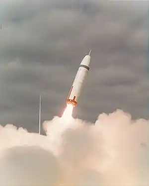 The Trident missile is a submarine-launched ballistic missile (SLBM) equipped with multiple independently targetable reentry vehicles (MIRV). Originally developed by Lockheed Missiles and Space Corporation, the missile is armed with thermonuclear warheads and is launched from nuclear-powered ballistic missile submarines (SSBNs). Trident missiles are carried by fourteen United States Navy Ohio-class submarines, with American warheads, as well as four Royal Navy Vanguard-class submarines, with British warheads. The missile is named after the mythological trident of Neptune.[1]