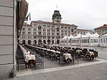 A collage of Trieste showing the Piazza Unità d'Italia, the Canal Grande (Grand Canal), the Serbian Orthodox church, a narrow street of the Old City, the Castello Miramare, and the city seafront seen from the Molo Audace | |