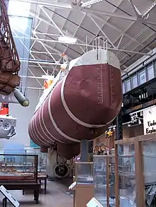 Following the mission, Trieste was returned to San Diego and taken out of service in 1966.[6][22] Between 1964 and 1966, Trieste was used to develop her replacement, the Trieste II, with the original Terni pressure sphere reincorporated in her successor.[4][23] In early 1980, she was transported to the Washington Navy Yard where she remains on exhibit today in the National Museum of the U.S. Navy, along with the Krupp pressure sphere.[20]
