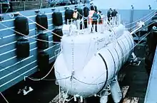 On 25 April 1972, Trieste II recovered a satellite package called a "bucket" weighing several hundred pounds from a depth of greater than 16,000 feet (4,900 m), a record at the time.[1] Trieste II (DSV-1) continued her active service in the Pacific Fleet into 1980.