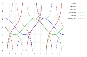 In mathematics, the trigonometric functions (also called circular functions, angle functions or goniometric functions[1][2]) are real functions which relate an angle of a right-angled triangle to ratios of two side lengths. They are widely used in all sciences that are related to geometry, such as navigation, solid mechanics, celestial mechanics, geodesy, and many others. They are among the simplest periodic functions, and as such are also widely used for studying periodic phenomena through Fourier analysis.