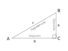 In this right triangle, denoting the measure of angle BAC as A: sin A = a/c; cos A = b/c; tan A = a/b.