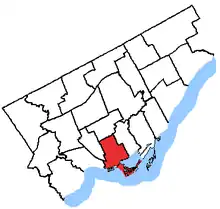 It consists of the Toronto Islands and the part of the City of Toronto bounded on the south by Toronto Harbour, and on the west, north and east by a line drawn from the harbour north on Spencer Avenue, east along the Gardiner Expressway, north on Dufferin, east on Queen Street West, southeast along the Canadian Pacific Railway line, north along Dovercourt Road, east along Dundas Street West, north along Ossington Avenue, east along the Canadian Pacific Railway situated north of Dupont Street, south along Avenue Road and Queens Park Crescent West, east along College Street and south along Yonge Street to the Harbour.