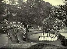 Provost Thomas C. S. Macklem succeeded Welch in 1900, and entered office in favour of federation with the University of Toronto.[60] In a newspaper interview, Reverend Macklem declared that "the time has come when neither the University of Toronto nor Trinity University can afford to stand aloof from one another any longer without sacrificing a great national ideal."[61] Macklem was Trinity's first Canadian-born Provost, and proved an ardent reformer, who quickly banned beer and hazing over the strong opposition of the student body.[62] In 1901, the Provincial Legislature amended the University of Toronto Act to facilitate a possible federation with Trinity.[63] Trinity celebrated its fiftieth anniversary in 1902, still an independent university, but undergoing negotiations with the University of Toronto on federation. To mark the occasion, Trinity conferred honorary degrees to Premier George William Ross, and renowned physician William Osler.[64] The next year, after what Macklem described as a "long-drawn and bitter" series of debates, the College Corporation voted 121 to 73 in favour of federation with the University of Toronto.[65][60][66] Opponents of federation sought a judicial injunction against the agreement, but were unsuccessful. The University of Toronto made a concession to allow Trinity to grant its own degrees in theology, which required the university to remove the restriction from its governing charter.[60]