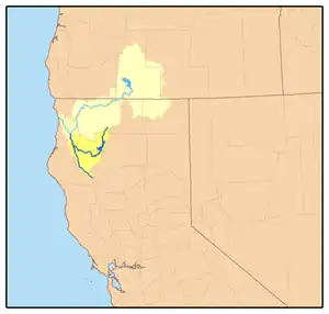 The Trinity River watershed borders several major California drainage basins; these are the Mad River and Redwood Creek to the west, the Salmon River and Scott River (tributaries of the Klamath River) to the north, and Clear Creek and Cottonwood Creek (both tributaries of the Sacramento River) to the east and south, respectively.[5] Fir, oak, and pine forests cover about 92 percent of the watershed. Chaparral and shrubs account for slightly over 5 percent, and grassland and barren land each cover approximately 1 percent. Riparian zones and wetlands encompass 0.5 percent of the watershed. Less than 2 percent of the watershed is urbanized.[22]