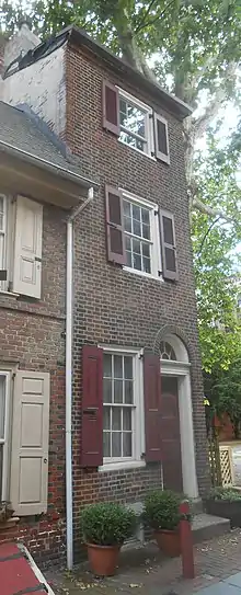 A Trinity house, also known as a Father, Son & Holy Ghost house, is a small townhouse, principally found in Philadelphia, Pennsylvania.[1] Trinity houses are characterized by small size, with three or four floors vertically stacked, each usually consisting of one principal room, many of which were built in the 18th and 19th centuries. They are joined by small, winding stairways, and have few or no interior doors. The "Trinity" name is derived from three floors, three rooms. Kitchens are usually in the basement, with very low headroom. Houses are typically smaller than 1,000 square feet (93 m2), and about 14 feet (4.3 m) wide. The selection of furnishings for such houses is strictly limited by the difficulty of moving furniture between floors.[2][3][4]