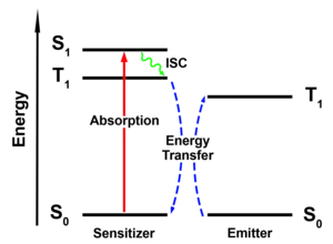 Triplet-triplet annihilation combines the energy of two triplet-excited molecules onto one molecule to produce a higher excited state. Since the higher excited state is an emissive singlet state, TTA can be used to achieve photon upconversion which is a process that converts the energy of two photons into one photon of higher energy.[7][8] To achieve photon upconversion through triplet-triplet annihilation two types of molecules are often combined: a sensitizer and an emitter (annihilator).[9] The sensitizer absorbs the low energy photon and populates its first excited triplet state (T1) through intersystem crossing. The sensitizer then transfers the excitation energy to the emitter, resulting in a triplet excited emitter and a ground state sensitizer. Two triplet-excited emitters can then undergo triplet-triplet annihilation to produce a singlet excited state (S1) of the emitter, which can emit an upconverted photon.