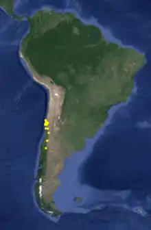 The mistletoe, Tristerix aphyllus, parasitizes two species of cactus, Echinopsis chiloensis and Eulychnia acida, and in its adult form shows only its flowers and its fruits, bursting forth spectacularly from the columnar cacti which are its hosts.[3] Mauseth (2011) discusses the morphological/anatomical effects of T. aphyllus on the cactus Echinopsis chiloensis.[4]