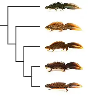 The crested newts are believed to have originated in the Balkans[26] and radiated in a brief time interval between 11.5 and 8 mya: First, the Balkan–Asian group (the Anatolian, Balkan and southern crested newt) branched off from the other crested newts, probably in a vicariance event caused by the separation of the Balkan and Anatolian land masses. The origin of current-day species is not fully understood so far, but one hypothesis suggests that ecological differences, notably in the adaptation to an aquatic lifestyle, may have evolved between populations and led to parapatric speciation.[10][27] Alternatively, the complex geological history of the Balkan peninsula may have further separated populations there, with subsequent allopatric speciation and the spread of species into their current ranges.[26]