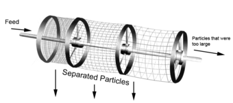Trommel screens are used widely in industries for its efficiency in material size separation. The trommel screening system is governed by the rotational velocity of the drum, mass flow rate of feed particles, size of the drum and inclination of trommel screen.[20]